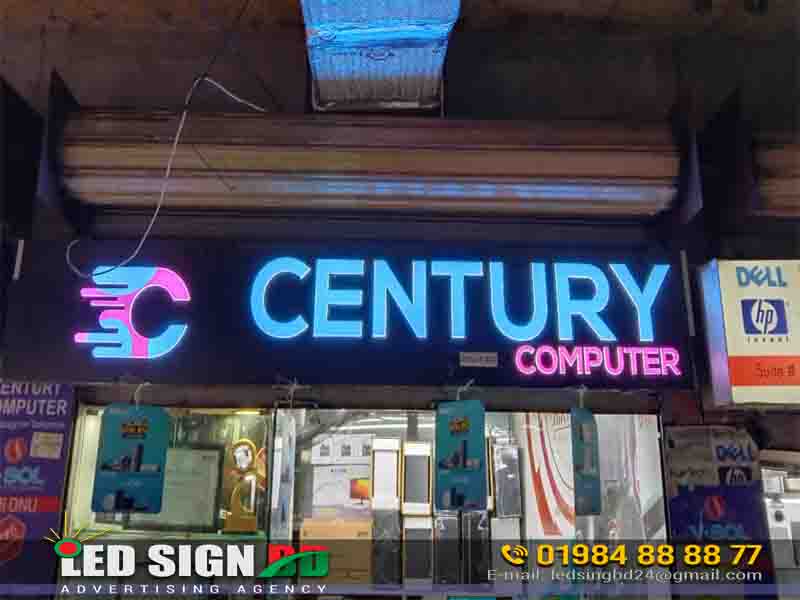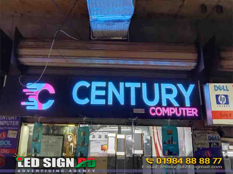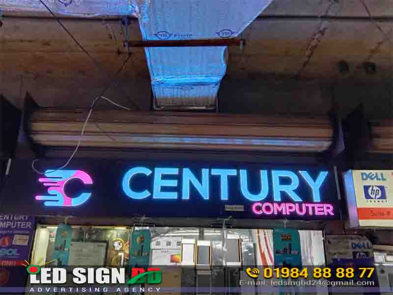 The image showcases a stylish acrylic LED sign board with bold 3D letters and vibrant lighting—perfect for computer shops, electronics stores, and corporate offices looking to enhance brand recognition.