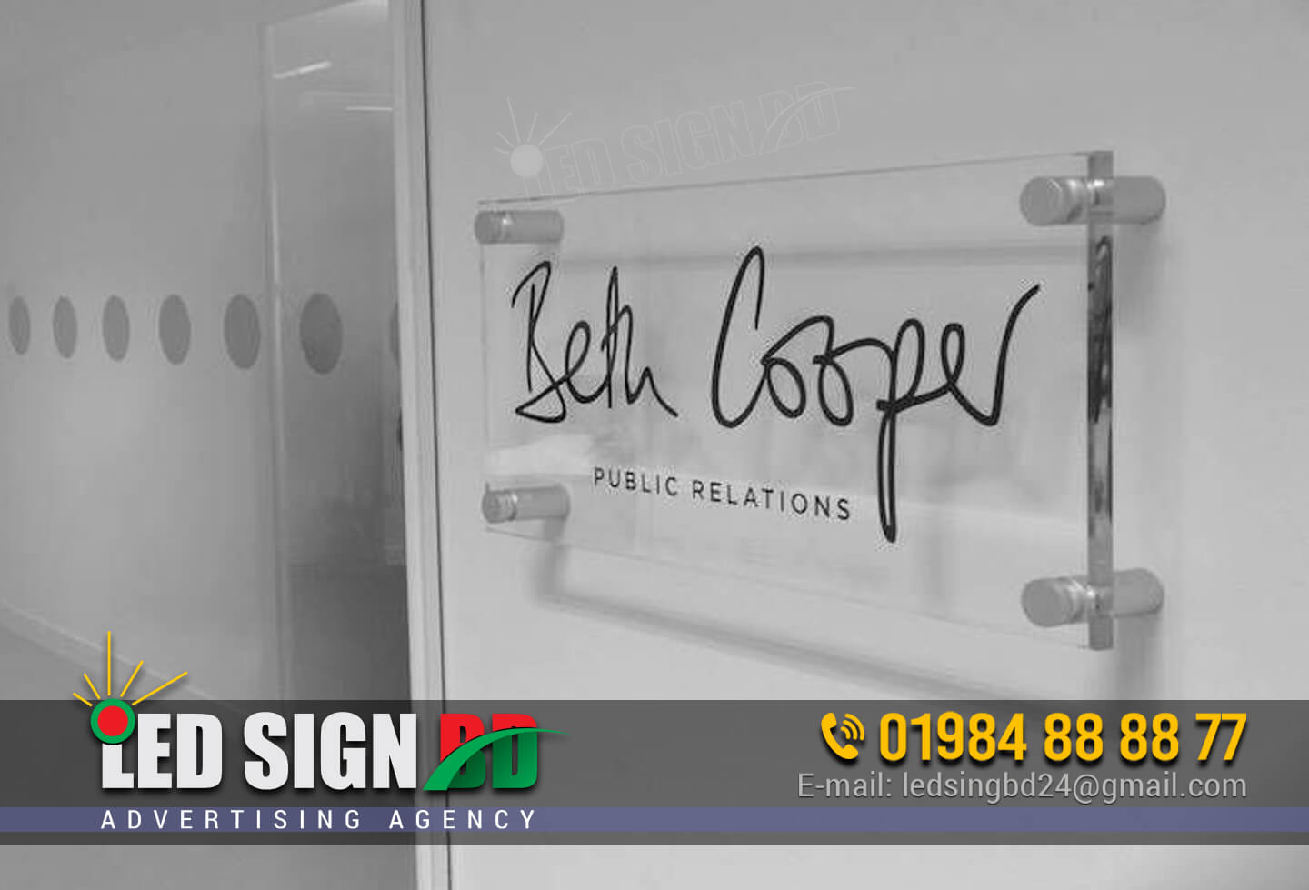 Looking for a stylish glass name plate for office desk, table, or door? We design and supply high-quality office glass name plates with modern and custom designs to match your workspace. Whether you need a name plate design for office glass doors, a professional glass name plate for office wholesale, or a durable glass name plate for office table, we provide elegant and affordable solutions. Our glass name plate price in Bangladesh is competitive, making it perfect for corporate offices, shops, and personal workspaces. For premium office glass name plates near you, trust Sign Maker BD for the best designs and installation services.