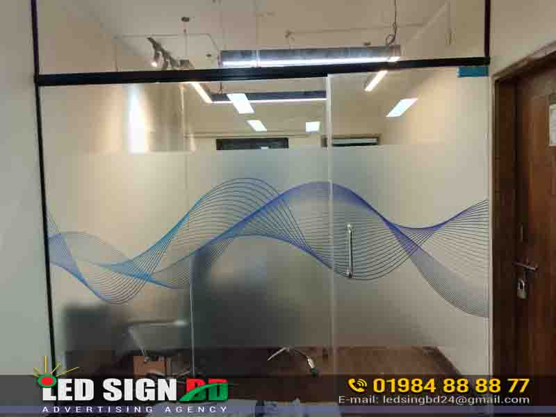 Enhance your corporate office interior with premium Glossy Print Thai Glass Sticker and frosted glass designs. Phone – 01844542499