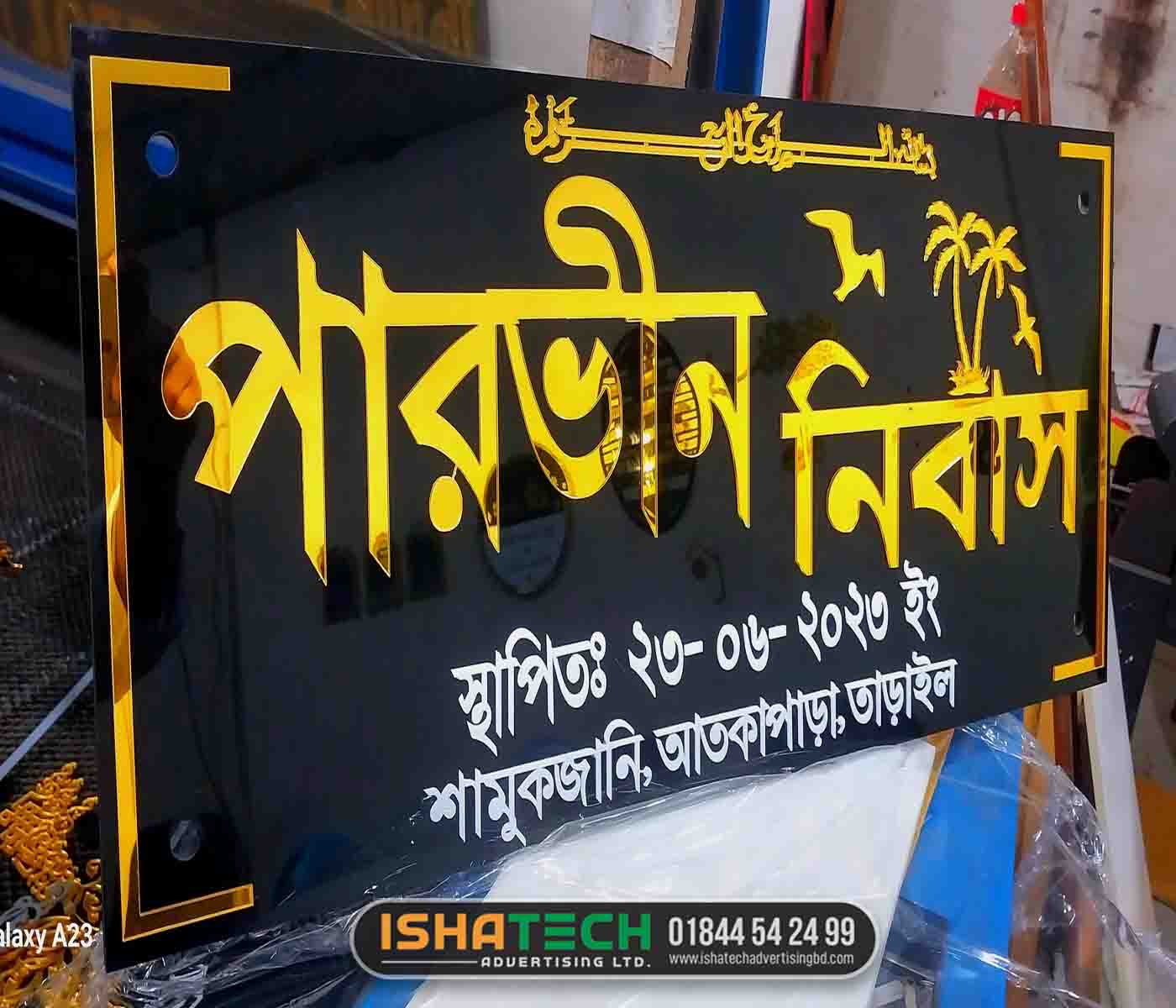 Golden color acrylic house nameplate. 3D Golden SS Home Nameplate for Pervin Nibash in Tarail. Name Plate – Designing and Manufacturing in Dhaka. Golden Stainless Steel Letter Name Plate. Golden Acrylic Bangla House Nameplate Design in BD. Nameplate company tarail tangail. Nameplate maker tarail. nameplate design service tarail. nameplate shop Tarail. Golden Color Stainless Steel House Name Plate.