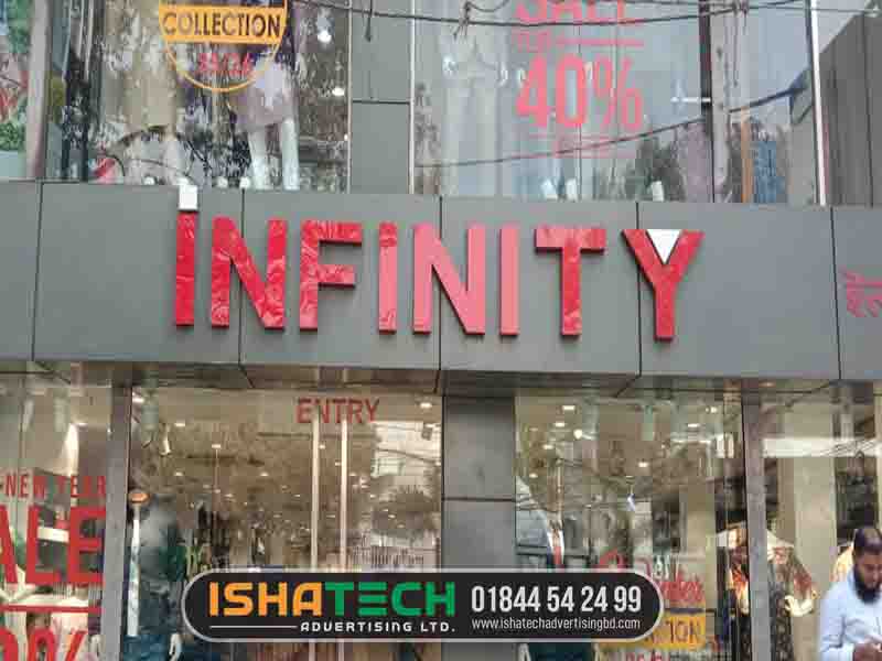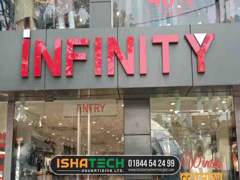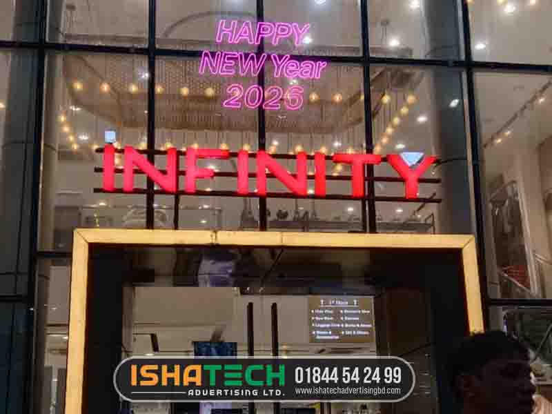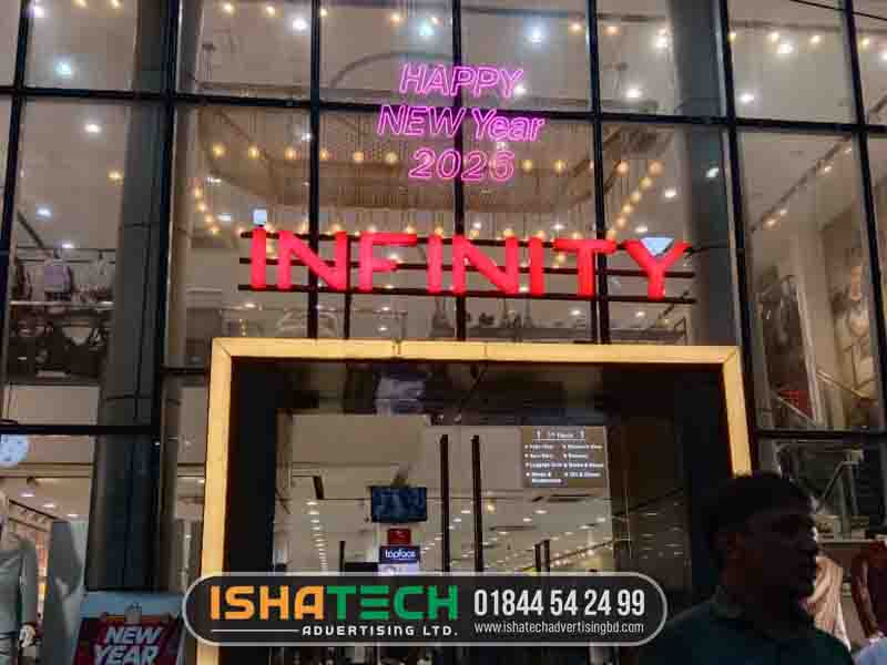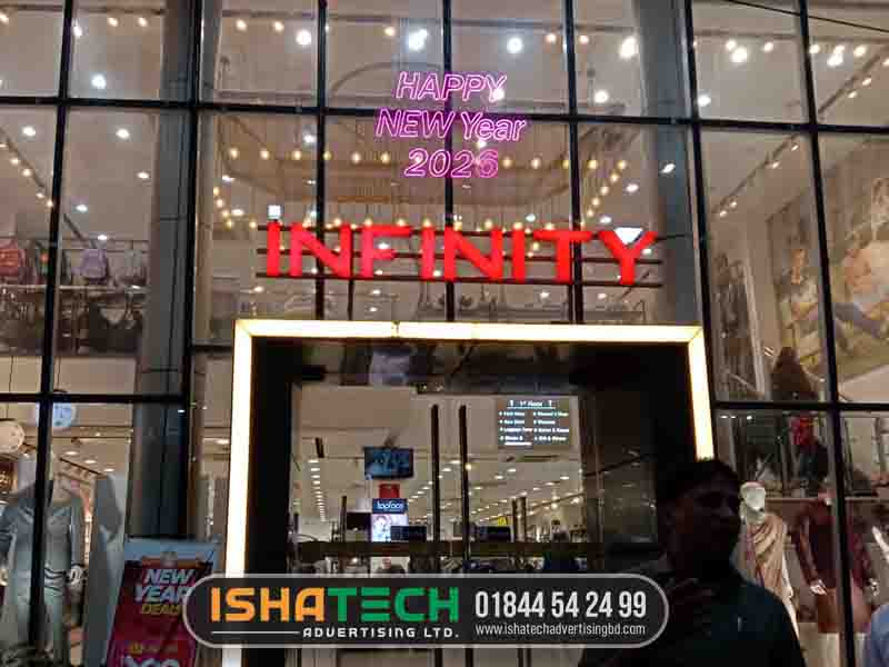 Main Entrance Signage: 3D acrylic or stainless steel channel letters with internal LED illumination are used to display the “iNFINITY Mega Mall” name prominently.
